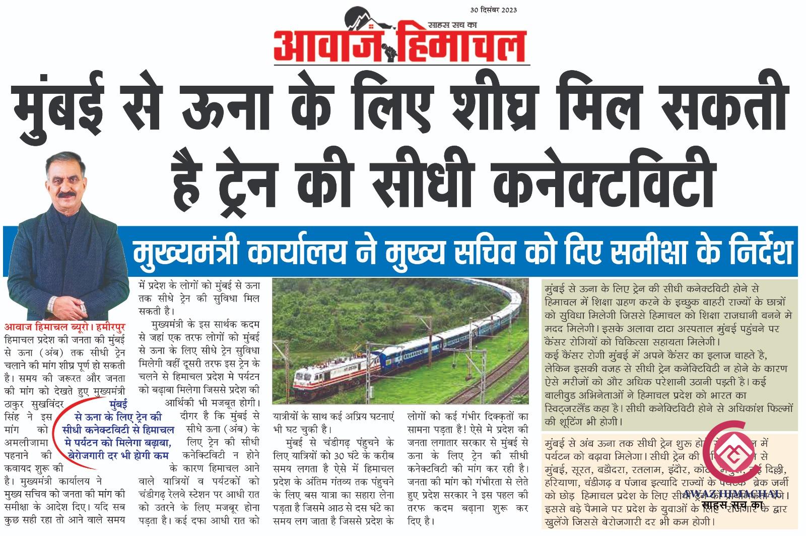 मुंबई (बांद्रा) से दौलतपुर (ऊना) को सीधे रेल कनेक्टविटी से जोडऩे की कवायद शुरू